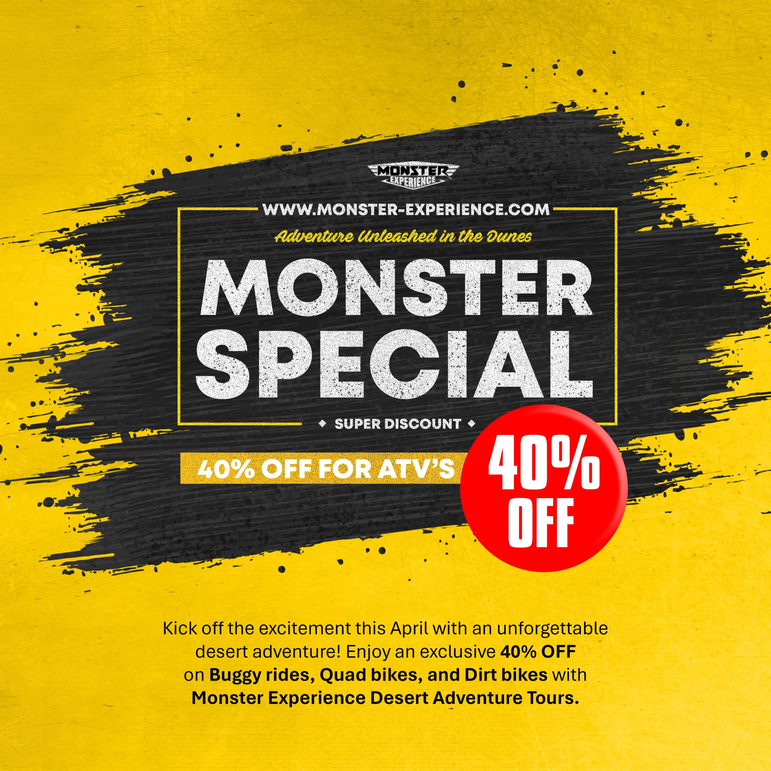 Fuel your adventurous spirit with Monster Experience! As your top choice for quad biking in desert Dubai, we offer premium quad bike rentals that promise non-stop fun. Feel the pulse of the desert as you navigate its dunes on our guided quad biking tours. If your obsession is all about ATV bikes, then brace yourself to discover the world of quad biking Dubai with us, a must-do adventure in the Arab world.